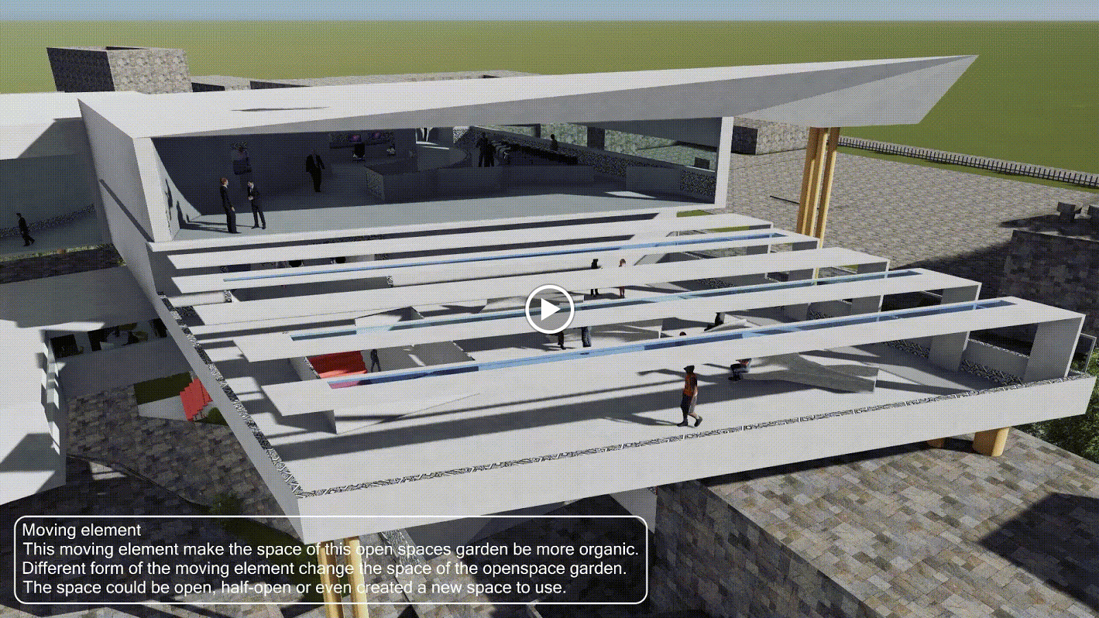 Moving element: This moving element makes the space of this open space garden to be more organic. A different form of the moving element changes the space of the open space garden. The space could be open, half-open, or even created a new space to use. |